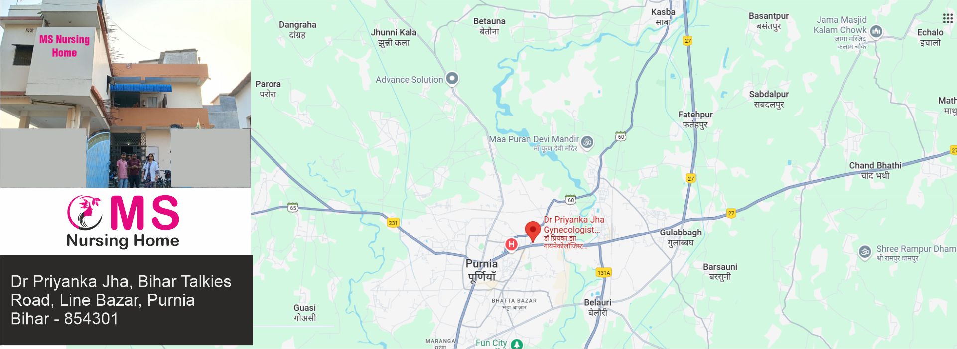 MS Nursing Home at Purnia is promoted by Dr Priyanka Jha. Dr Jha has extensive experience in the treatment of all kinds of women diseases. MS Nursing Home is the leading Maternity Centre in Purnia with facilities for Normal and Cesarean Delivery. Dr Priyanka Jha has the experience of performing all kinds of Gynecological Surgeries including Laparoscopic procedures. The Nursing Home has 25 beds and provides affordable and high quality treatment to the patients coming to Purnia from far off places.